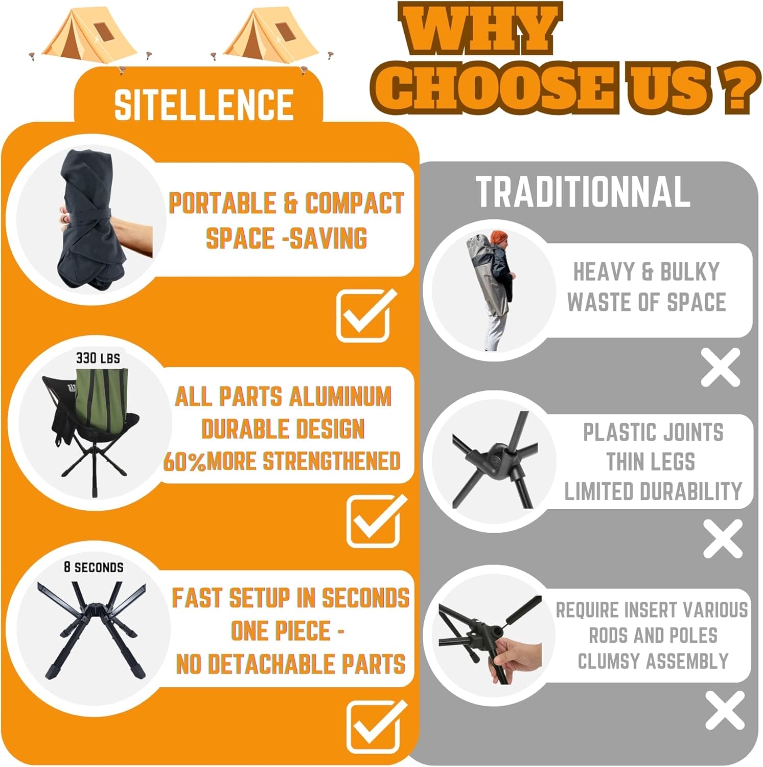 Compact Camping Chairs for Adults: ADJ camping chair features a compact folding size of just 15” x 3.9” x 3.9” for easy portability. When open, it’s 35% larger comparing with other portable chairs/stools, providing a spacious and comfortable seating experience. Perfect for camping, picnics, beach days, music festivals, sports events, fishing, and tailgates.