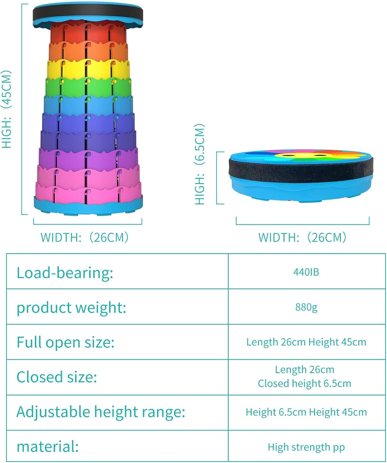 【Portable and Lightweight】 The pack size is only 25cm/9.8” and weighs just 1kg/2.21lbs,but the load capacity about 440 lbs ,we are also using this portable chair for adults,you can use it boldly.This folding stool is small and compact to place into luggage or storage.