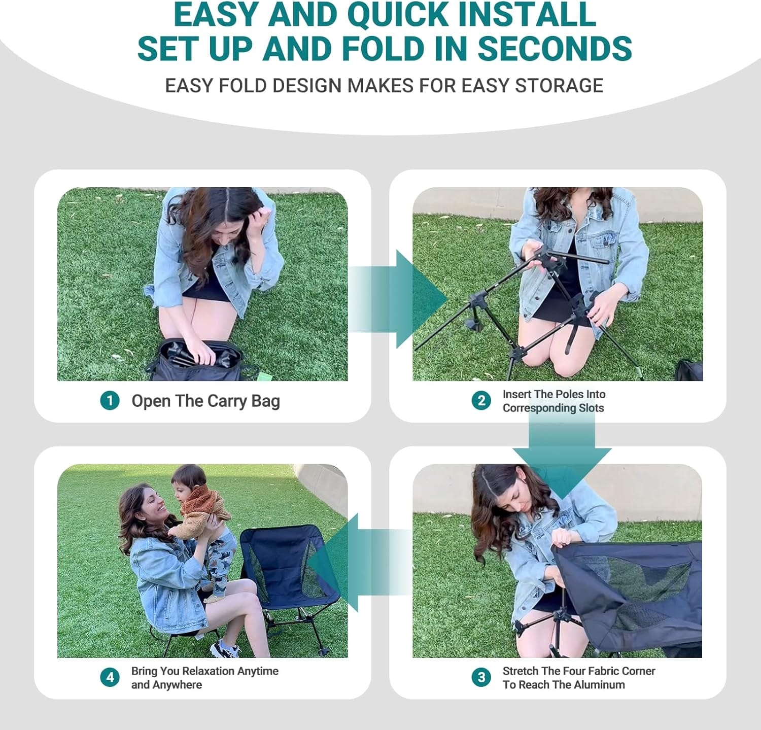 Ultra-Portable for Backpacking Adventures: Weighing just 2.5 lbs, this compact camping chair folds down small and packs into a zippered storage bag, making it perfect for backpackers, hikers, and minimalist travelers. The push-pull aluminum frame system allows for quick setup and takedown—no tools needed—saving space and time on the go