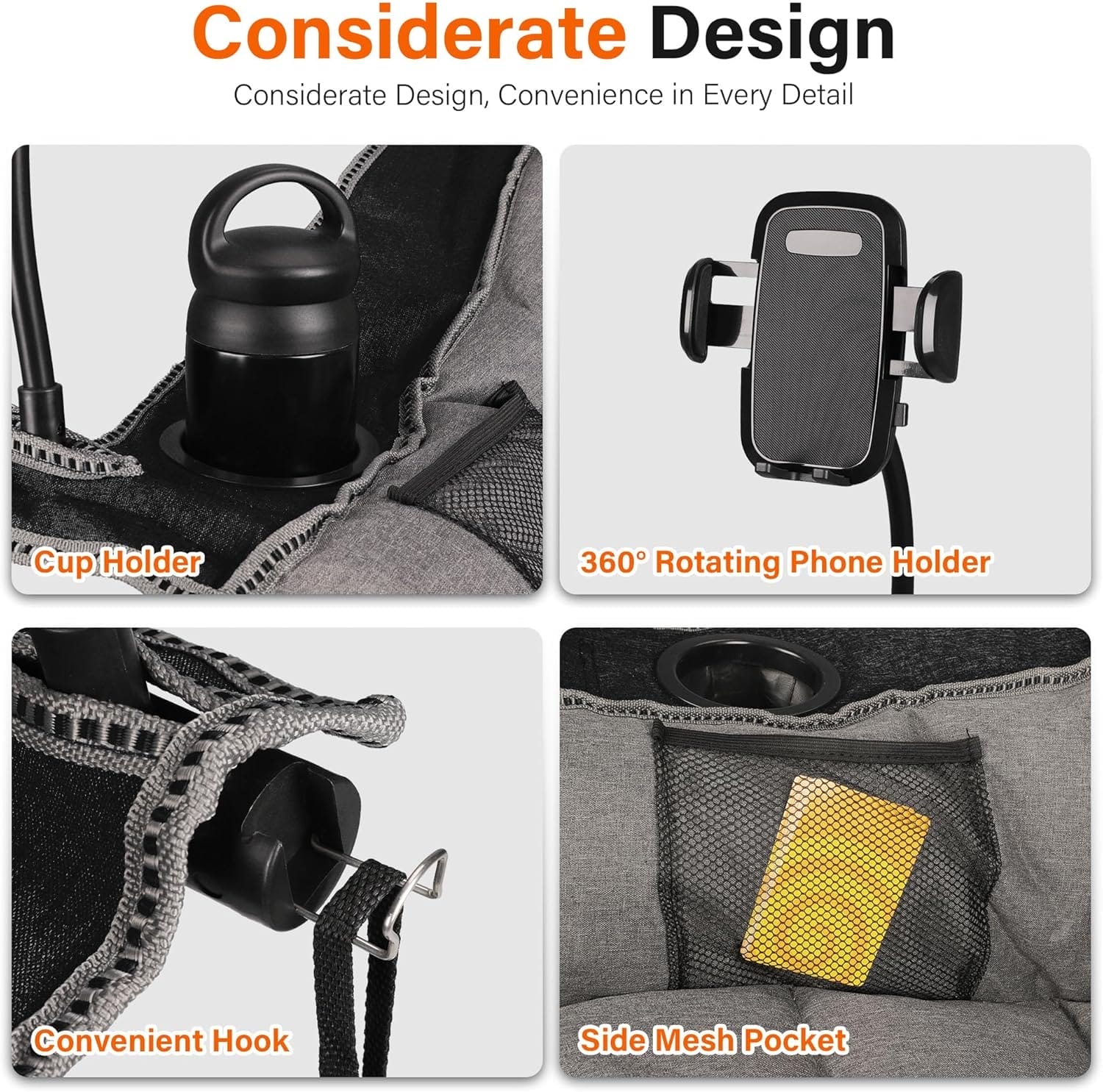 User-Friendly Details:With a large cup holder,phone holder,and side mesh pocket,the oversized XL camping chair keeps your essentials handy.Perfect for outdoor comfort
