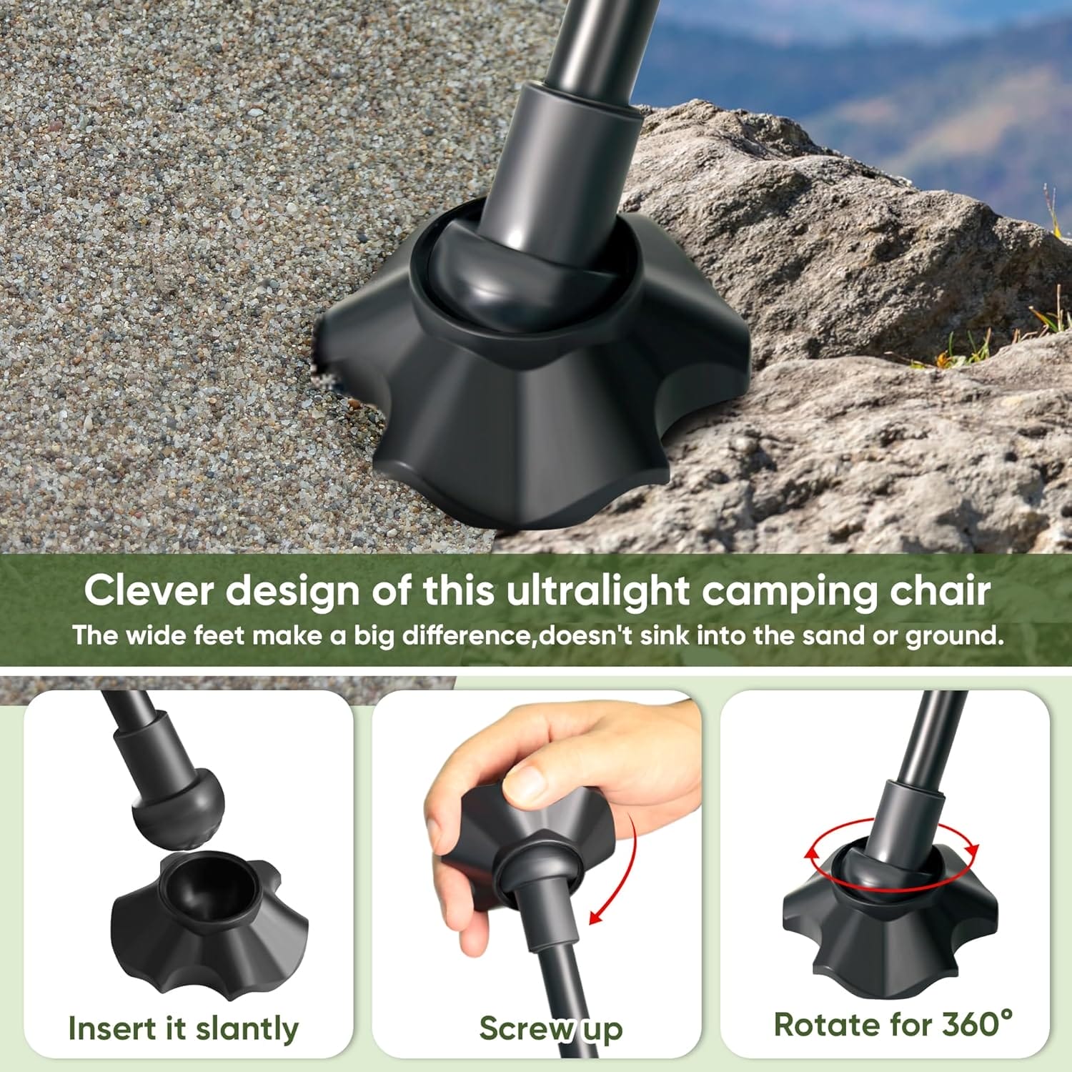 Upgrade Feet Design: Clever design of this foldable camping chairs for adults.High quality detachable anti-slip wide feet to increase feet area so it will not sink in sand or soft ground,you don’t have to pull it out of the dirt/grass forcefully to move this foldabel lawn chair.Folding backpacking chair is super stable and safe to use.These outdoor camp chairs for adults don’t tip over when you sit down and no concern the base will collapse.Ideal portable chairs for adults for travel.