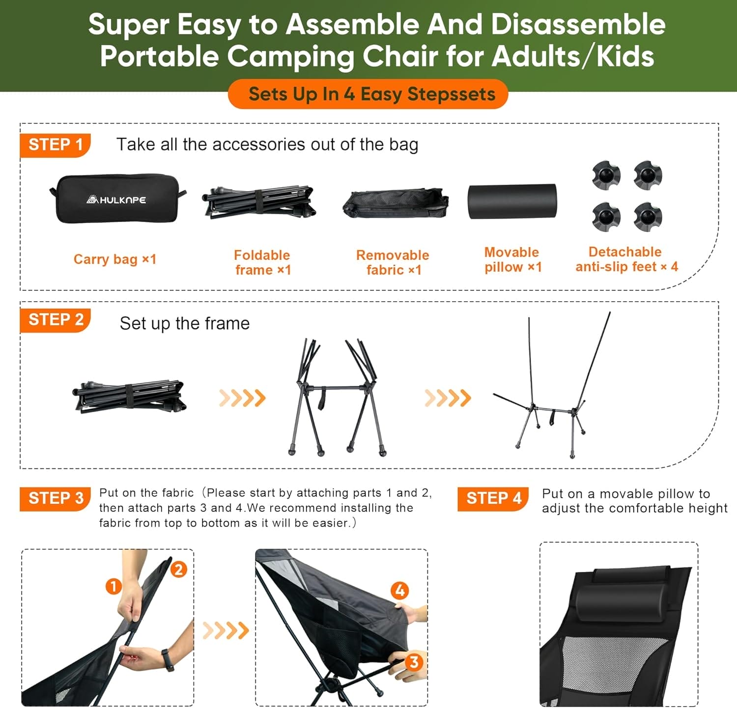 Feature:Camping chairs for adults,breathable and comfortable cooling ergonomic mesh back allows airflow through your back,carrying away the sweat and heat.Cup holder and side storage bag can hold your drink,keys,phones,and other items.Ergonomic design,enough support for your back,and the camping chairs for adults come with a removable pillow to enhance comfort.With this foldable camp chair you can enjoy comfort anywhere you go.Package includes a folding camp chair*1,pillow*1,storage bag*1.