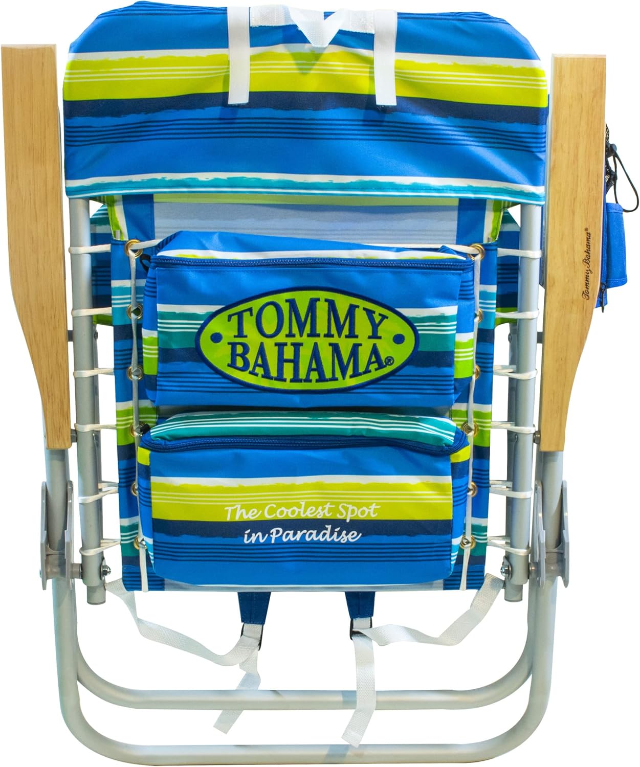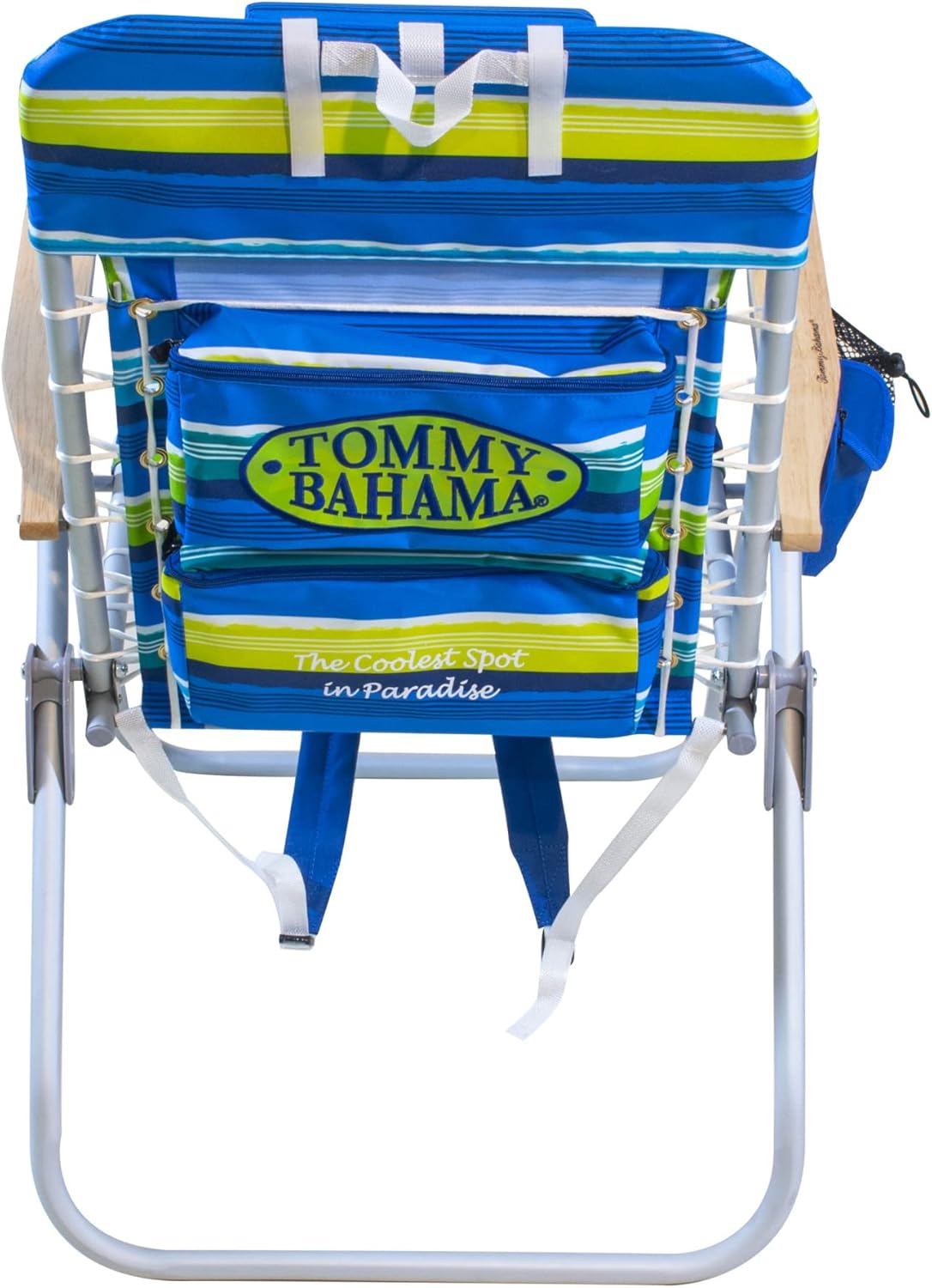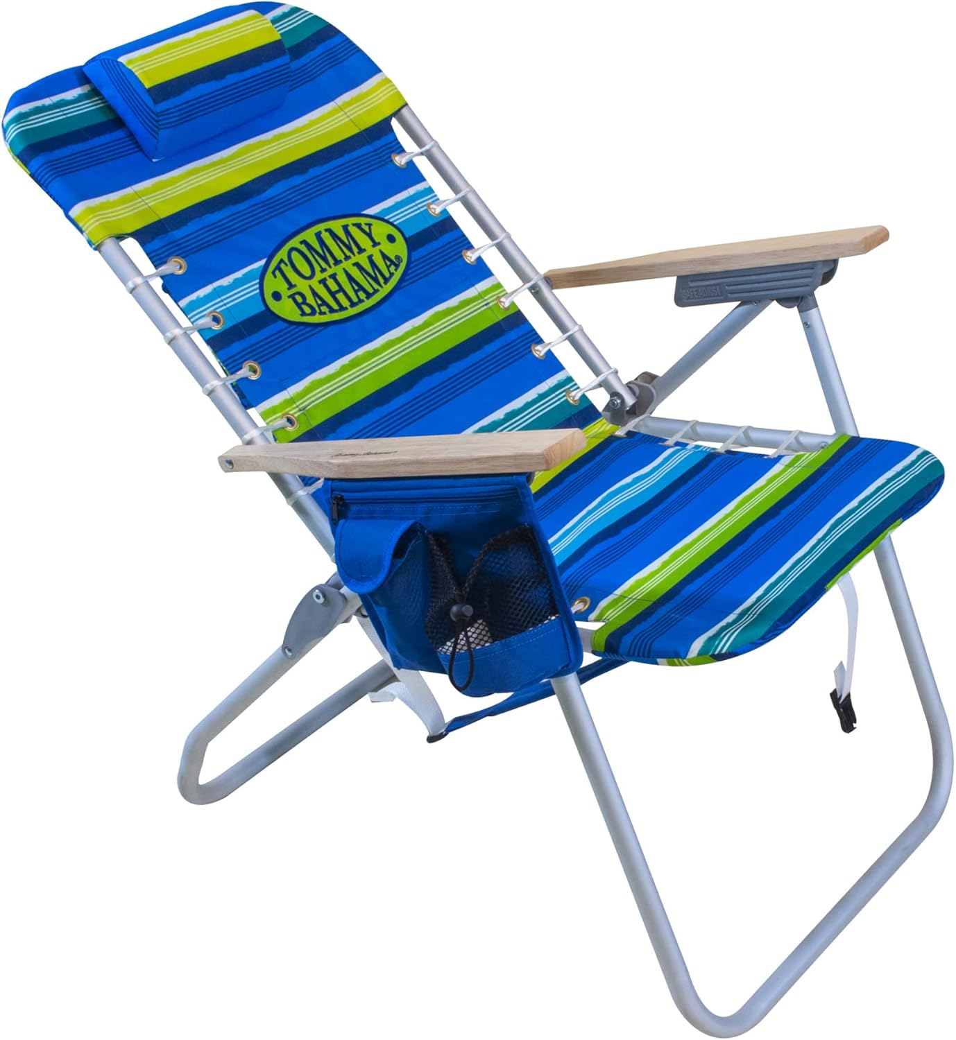 Travel hands-free! The adjustable, backpack shoulder straps allow for unrestricted movement and custom-fitability so you can travel in comfort. The flexible suspension supports and conforms to your body providing all day comfort. The lightweight, rust-proof aluminum folding chair frame is durable and sturdy. The outdoor reclining chair features 4 different reclining options. Recline without the worries of getting fingers or hands pinched with the SAFE-ADJUST technology built into the wooden armrests. The beach chair features convenience and personal storage with the seat-side storage pouch, cell phone case, and cup holder. For added comfort, the extended height backrest is ideal for the big and tall and includes a plush, flip-over pillow for head and neck support. When not at the beach, take anywhere outdoors. Ideal for concerts in the park, sitting on the sideline or using on the camp ground by the lake. The Hi-Boy beach chair with backpack straps is made of lightweight, rust-proof aluminum and weighs only 9 lbs. The Tommy Bahama Extended Height Beach Chair sits 17″ off the ground and has a maximum weight capacity of 250 lbs. When open, the chair measures 24.25″ x 25.75″ x 38″ and measures 24.25″ x 4.5″ x 35.75″ when folded.