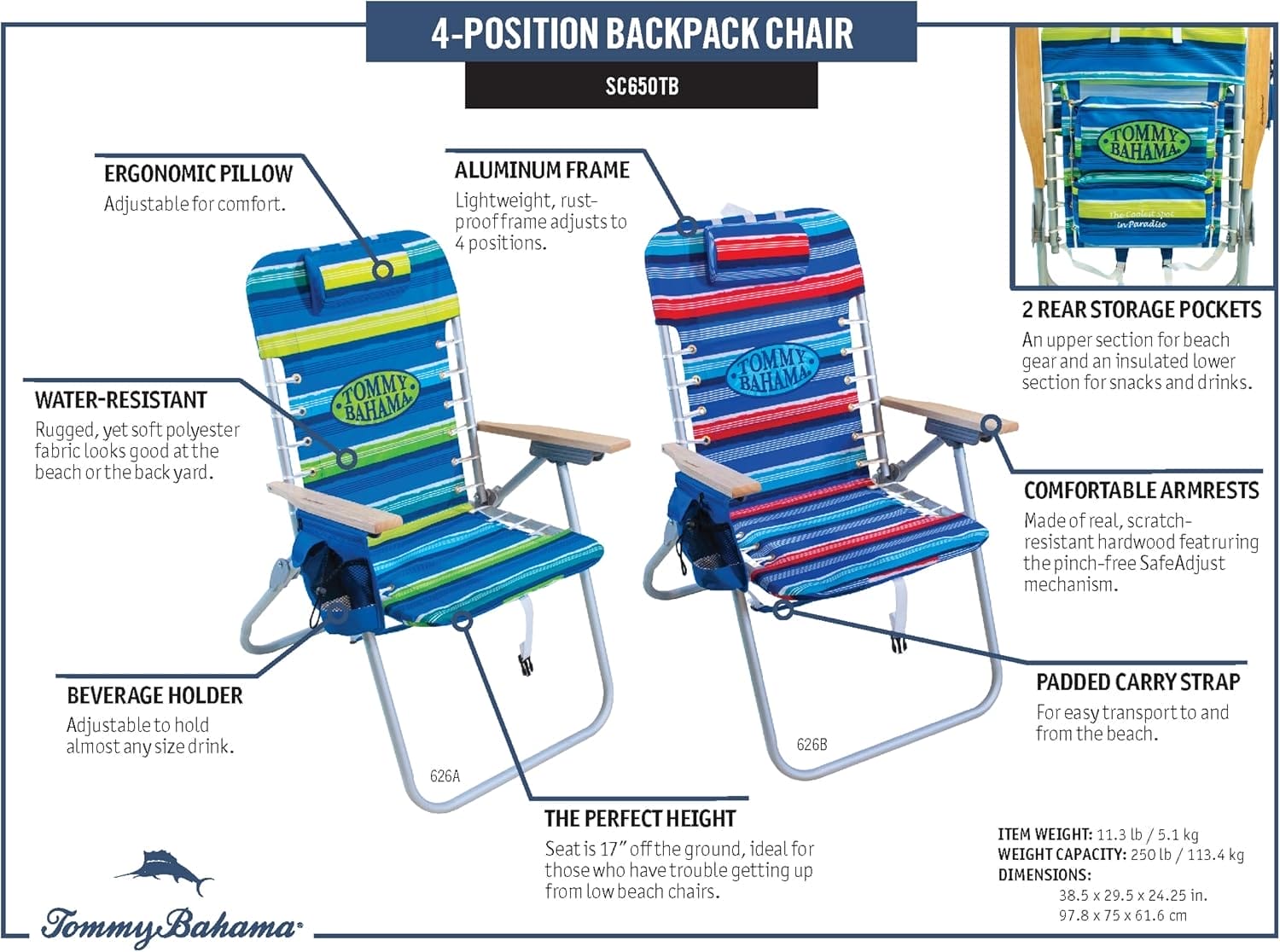 EXTRA TALL BEACH CHAIR: At 17″ off the ground, the Tommy Bahama extended seat height backpack chair higher than most beach chairs and offers hands-free portability with convenient backpack straps