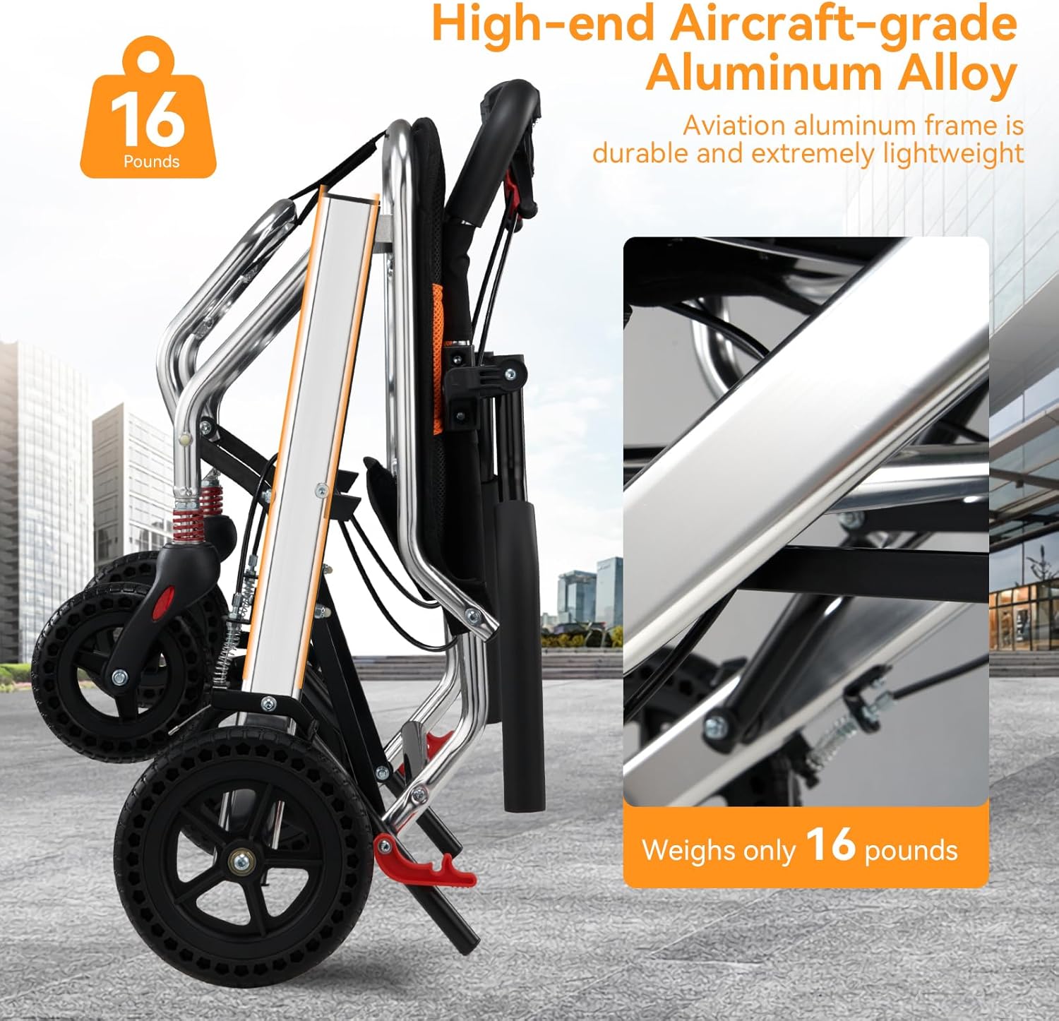 【HIGH-QUALITY SHOCK-ABSORBING HONEYCOMB WHEELS】Our travel wheelchair is equipped with high-quality shock-absorbing honeycomb wheels, and the tires are made of solid PVC, with 8-inch rear wheels and 6-inch front wheels with spring shock absorption system, which are resistant to slip and can overcome various terrain challenges, and enjoy a bump-free journey!