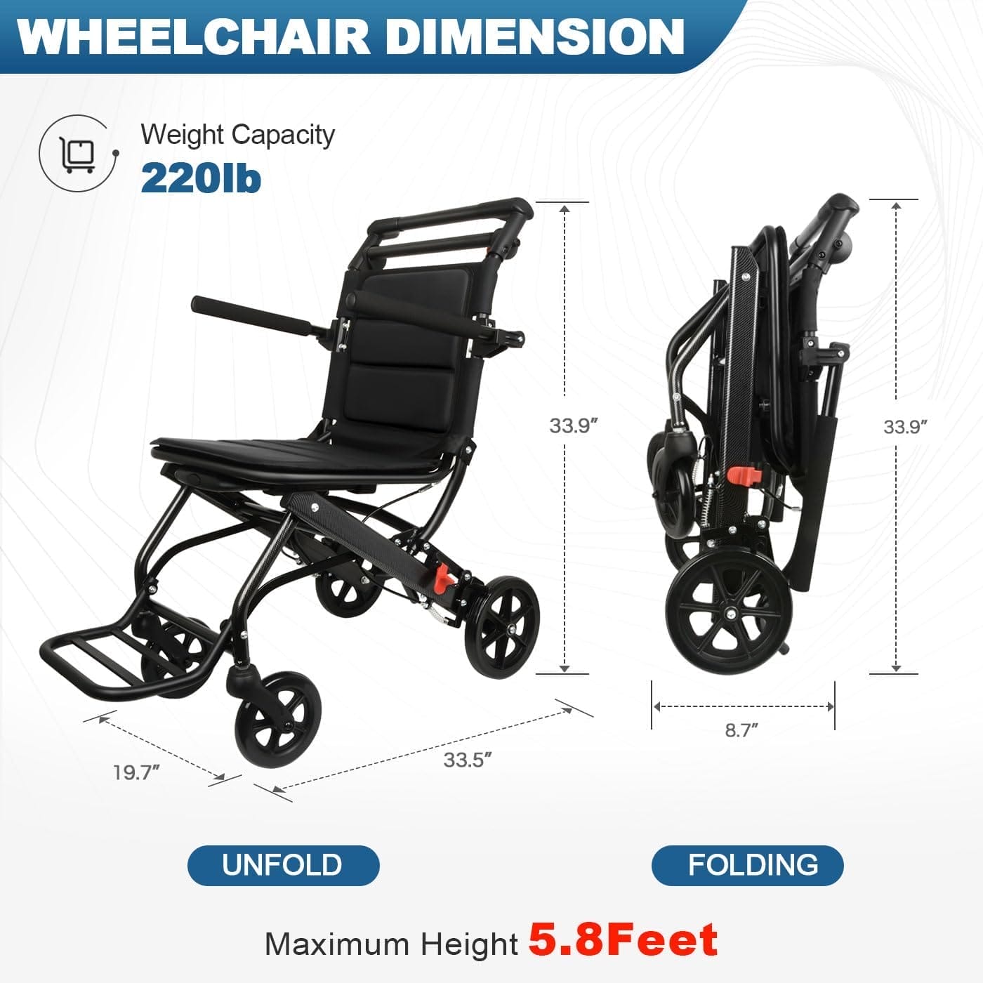 【Ultra-light Folding Wheelchair】The lightweight transport wheelchair is only 15 LBS, you can easy take it during you travel and the folding size is also very small, help you easy to put it into the carry bag, carry bag included, so you can take it on the trunk, the luggage rack of airplan and train.